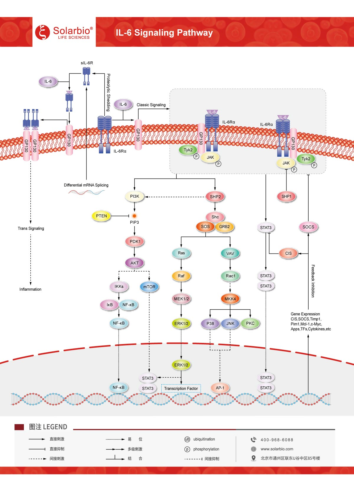 JAK與gp130的細(xì)胞質(zhì)結(jié)構(gòu)域長期結(jié)合。當(dāng)IL-6與其受體結(jié)合時,JAK被激活,導(dǎo)致STAT3磷酸化和STAT3同源二聚體的產(chǎn)生。然后,該復(fù)合物易位到細(xì)胞核,在那里它通過轉(zhuǎn)錄活性影響IL-6反應(yīng)基因(如急性期蛋白)的表達(dá)。